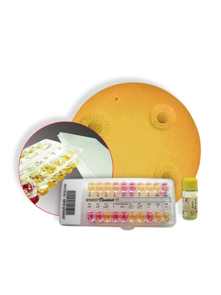 Testování souprava COMPLEMENT MYCOFAST® RevolutioN 2 (REF 00082), která umožňuje enumeraci a identifikaci Uu. a/nebo Mh., a také stanovení antibiotické citlivosti podle doporučení CLSI (Institut pro klinické a laboratorní normy).