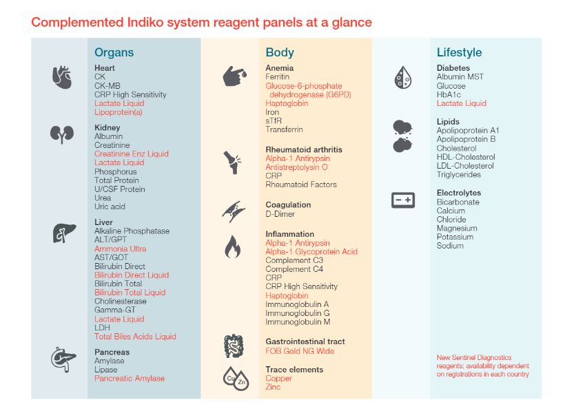 Thermo Scientific Indiko je plně automatizovaný analyzátor pro klinickou a specializovanou chemii, včetně enzymů, substrátů, elektrolytů, specifických proteinů, monitorování terapeutických léčiv, užívání narkotik a testy imunosupresivních léků. Najednou je možné provádět mnoho různých testů z jednoho vzorku. Bez jednotky ISE.