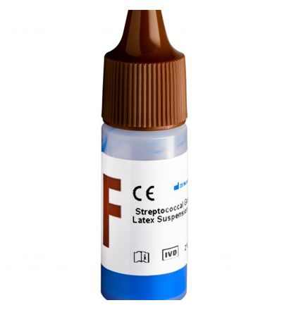 Modré latexové částice potažené purifikovanými králičími protilátkami proti streptokokům dané skupiny v lahvičce s kapátkem.